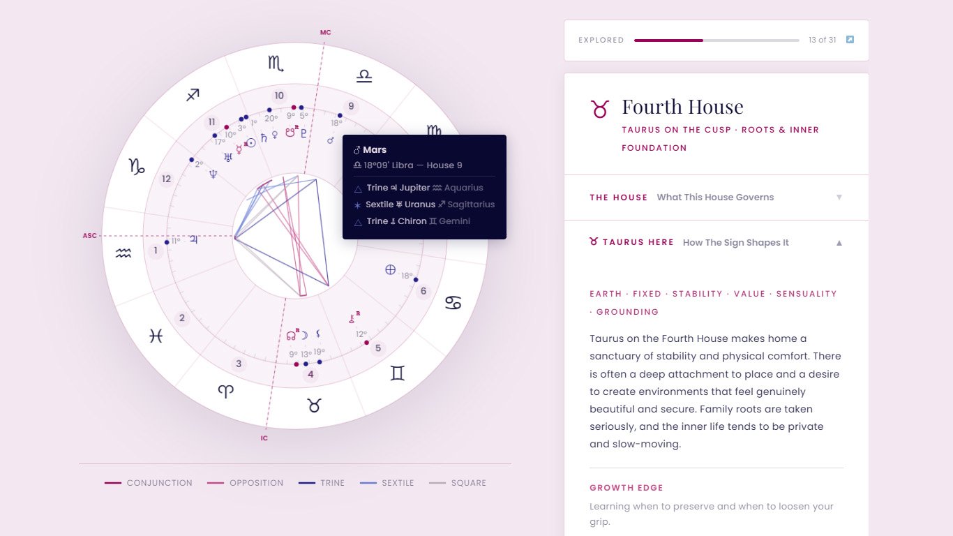 Pull up your chart. Look at your Big Three. Then spend time with the interactive wheel before you start reading individual placements. Structure first, meaning second — that sequence makes everything click faster.