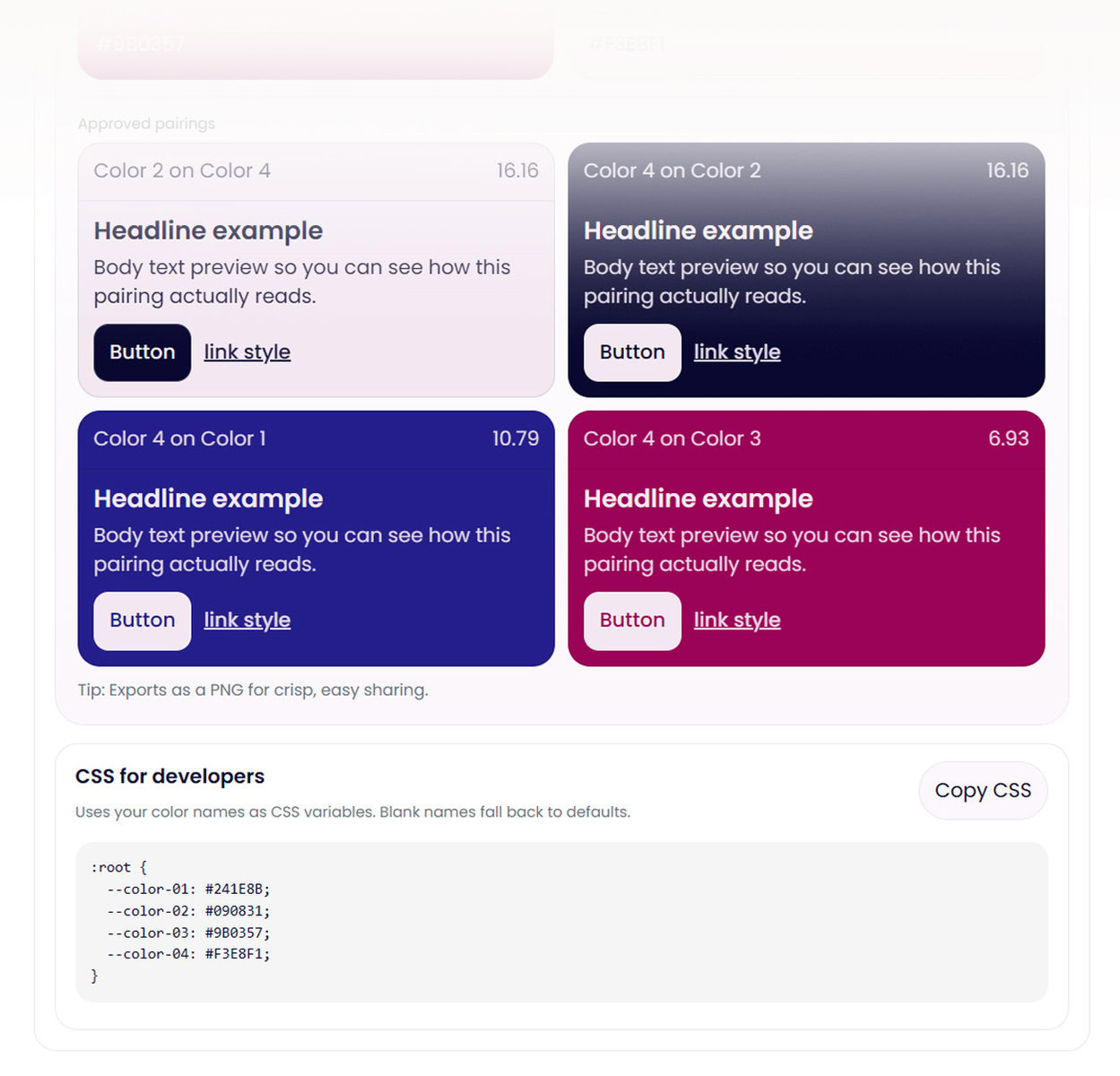 Add your colors or generate fresh ideas in a controlled environment, then check harmony and contrast, preview real pairings, and save a finished palette you can confidently use.