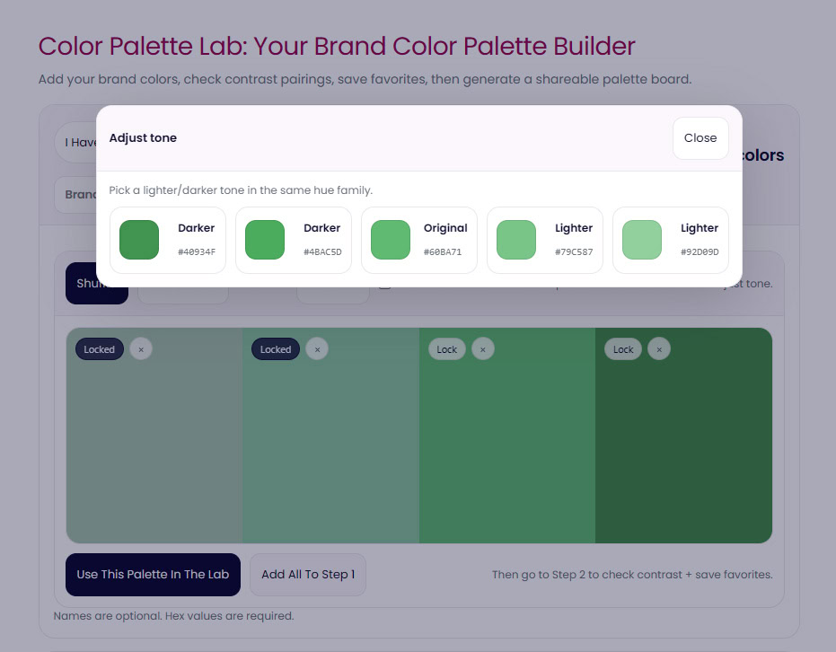 The Color Palette Lab™ is a designer-built color palette workspace for generating, building, testing, and refining brand colors in real time.