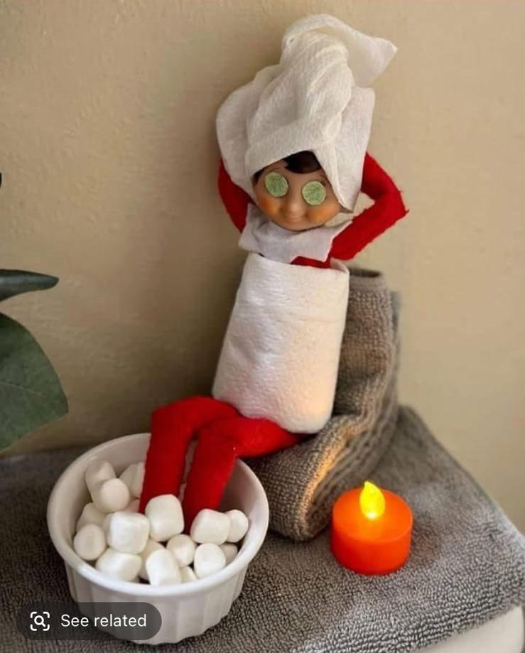 This one is both quick and hilarious. Especially if you’ve got the marshmallows already! Wrap your elf in a small towel, add “cucumber” eyes (use paper or felt!), and place their feet in a bowl of mini marshmallows like a bubble spa. Add a tiny candle for ambience and you’ve created the cutest elf spa day ever — zero prep, big laughs.