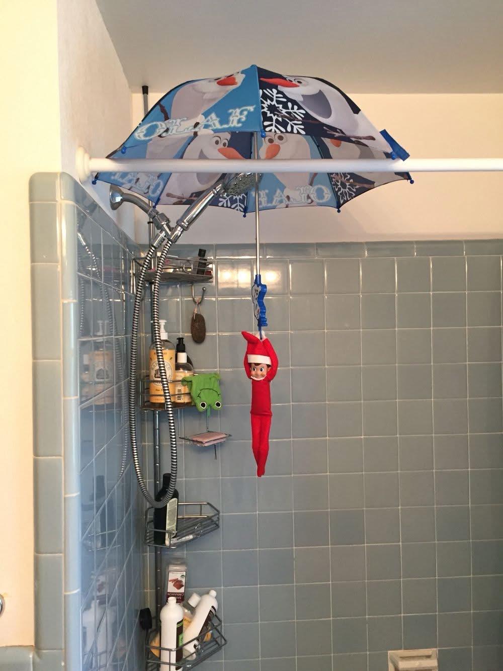 Hang a kid’s umbrella from the shower rod and clip your elf underneath like they’re zip-lining. It looks elaborate, but it’s totally last-minute-friendly.