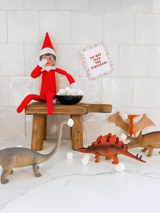 If you’ve got dinosaur lovers at home, this easy Elf on the Shelf idea is guaranteed to be a hit. Scatter mini marshmallows around your toy dinos and add a “Do Not Feed The Dinosaurs” sign. Your elf becomes the troublemaker instantly — and the setup takes under two minutes.
