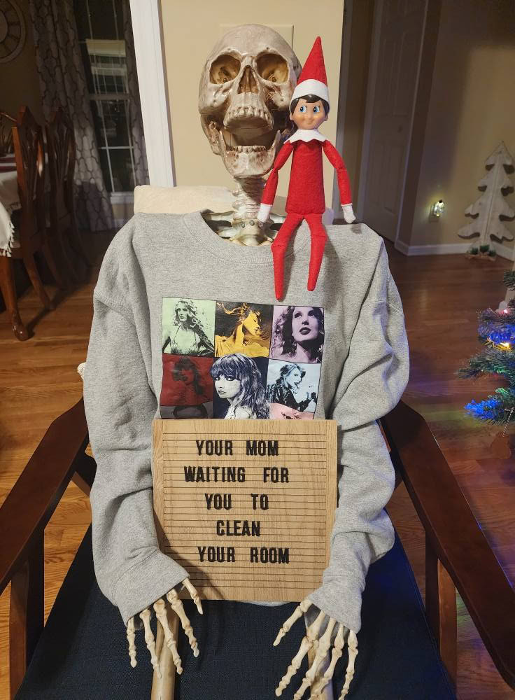 Dip back into your Halloween decor. Any size skeleton works for this quick Elf on the Shelf setup. Add a letterboard message or a note, perch your elf, and done. Hilarious.