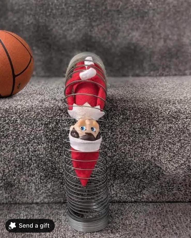 Pop your elf inside a slinky and send them “sliding” down the stairs or couch. A silly, easy setup guaranteed to be a kid fave.