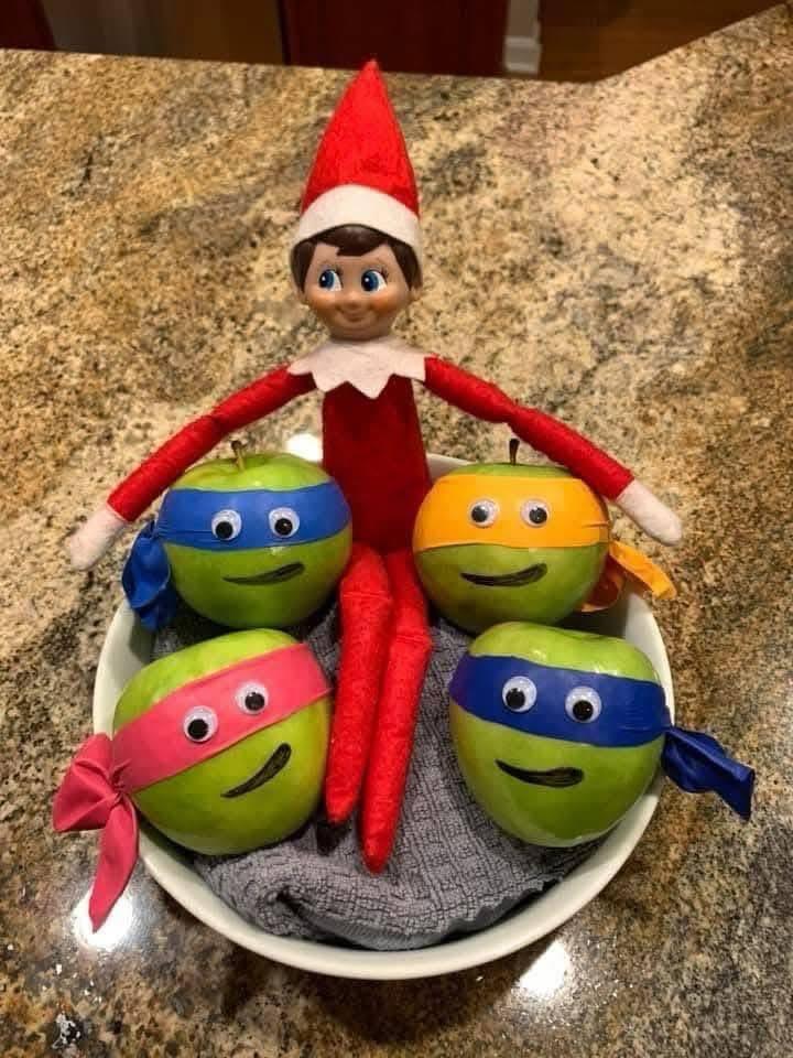This quick Elf on the Shelf idea is perfect for TMNT fans. Googly eyes + tape + green apples = instant elf squad. Zero prep, maximum cuteness.