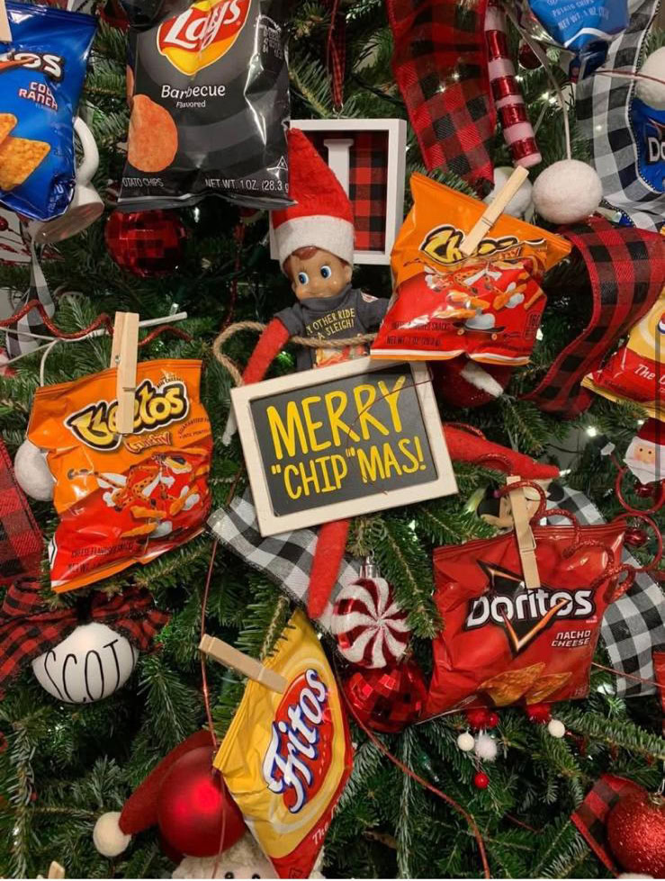 Clip mini chip bags all over the tree and add your elf with a cute “Merry Chip-mas!” sign. Fun, colorful, and mess-free.