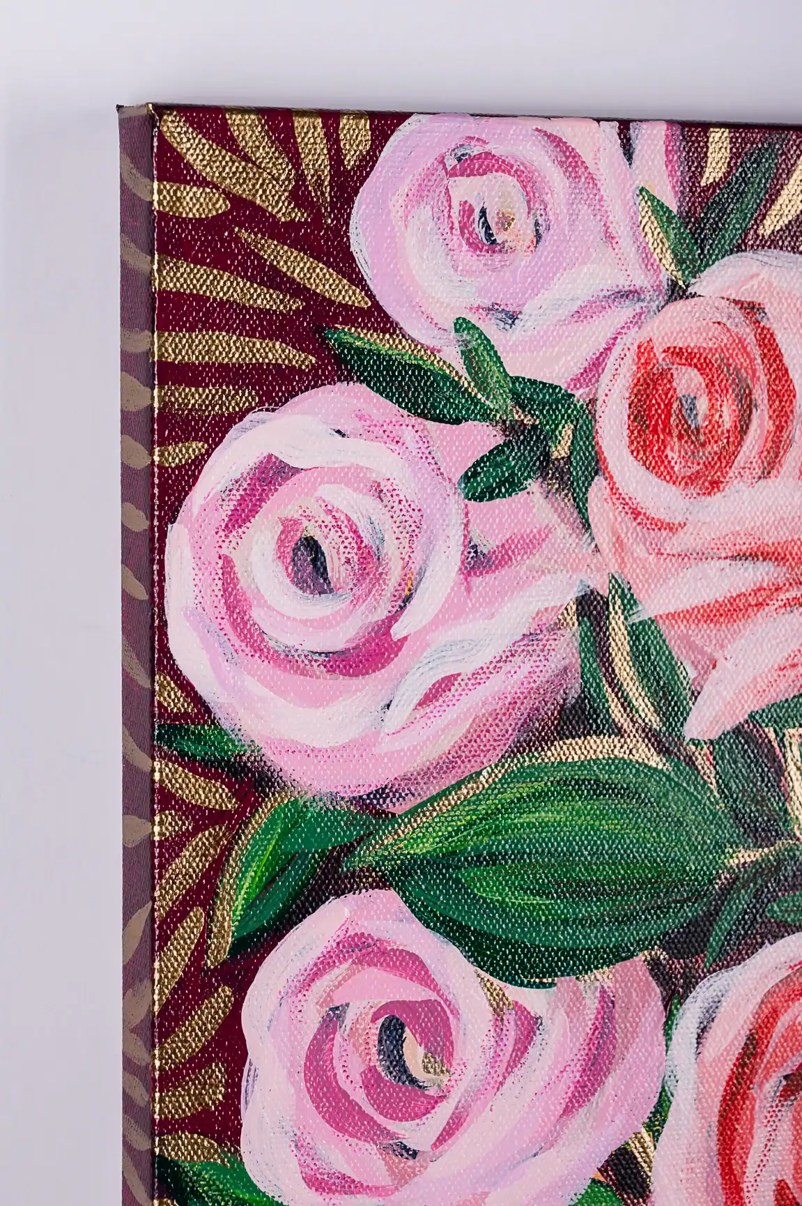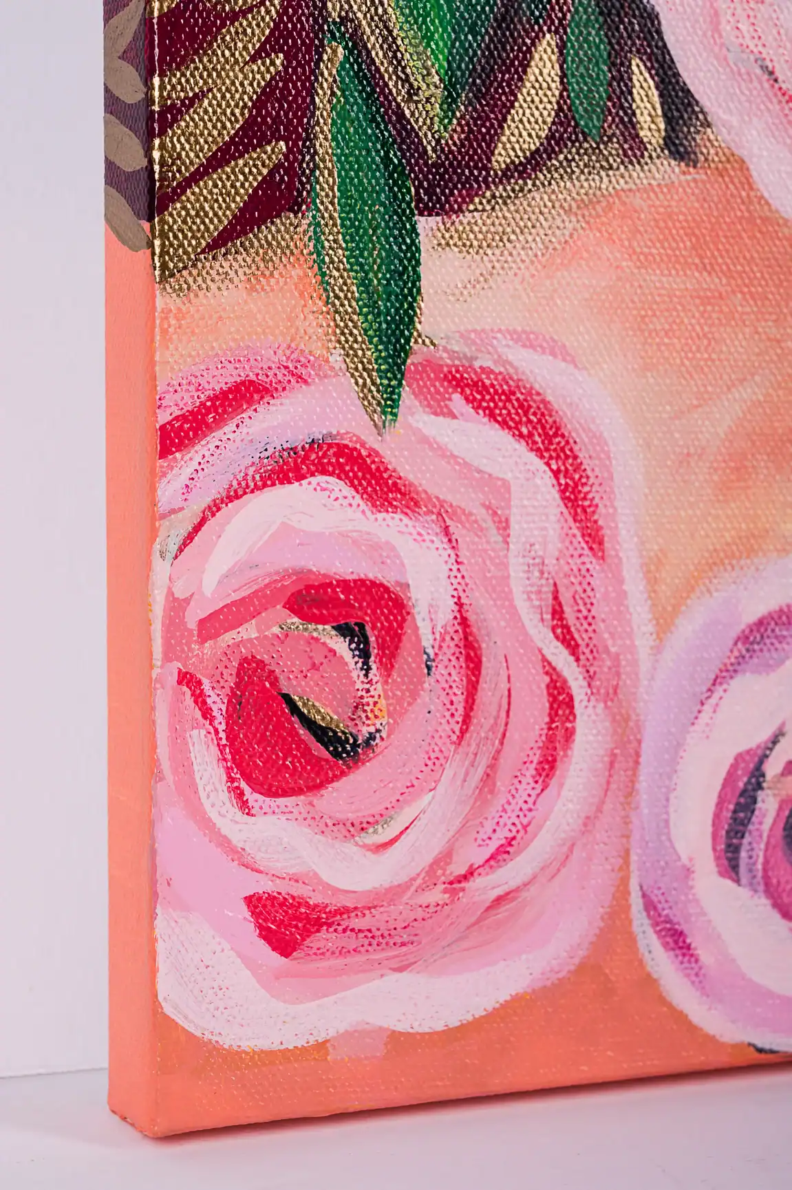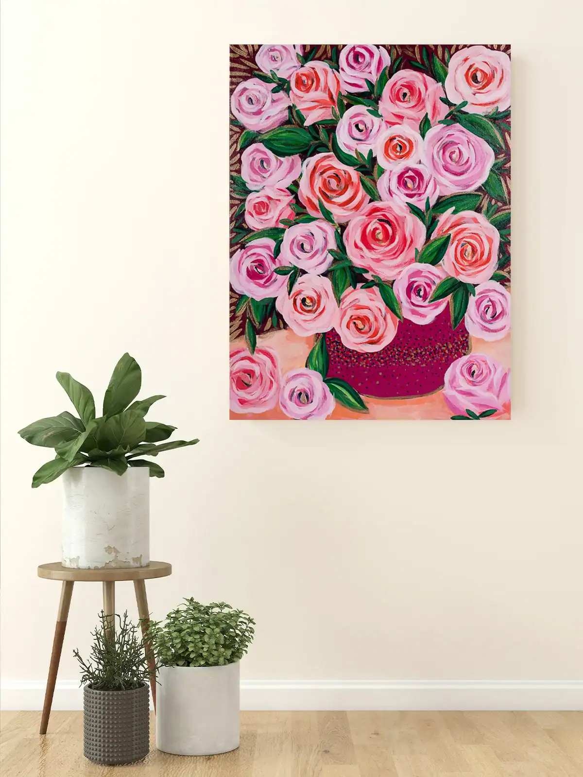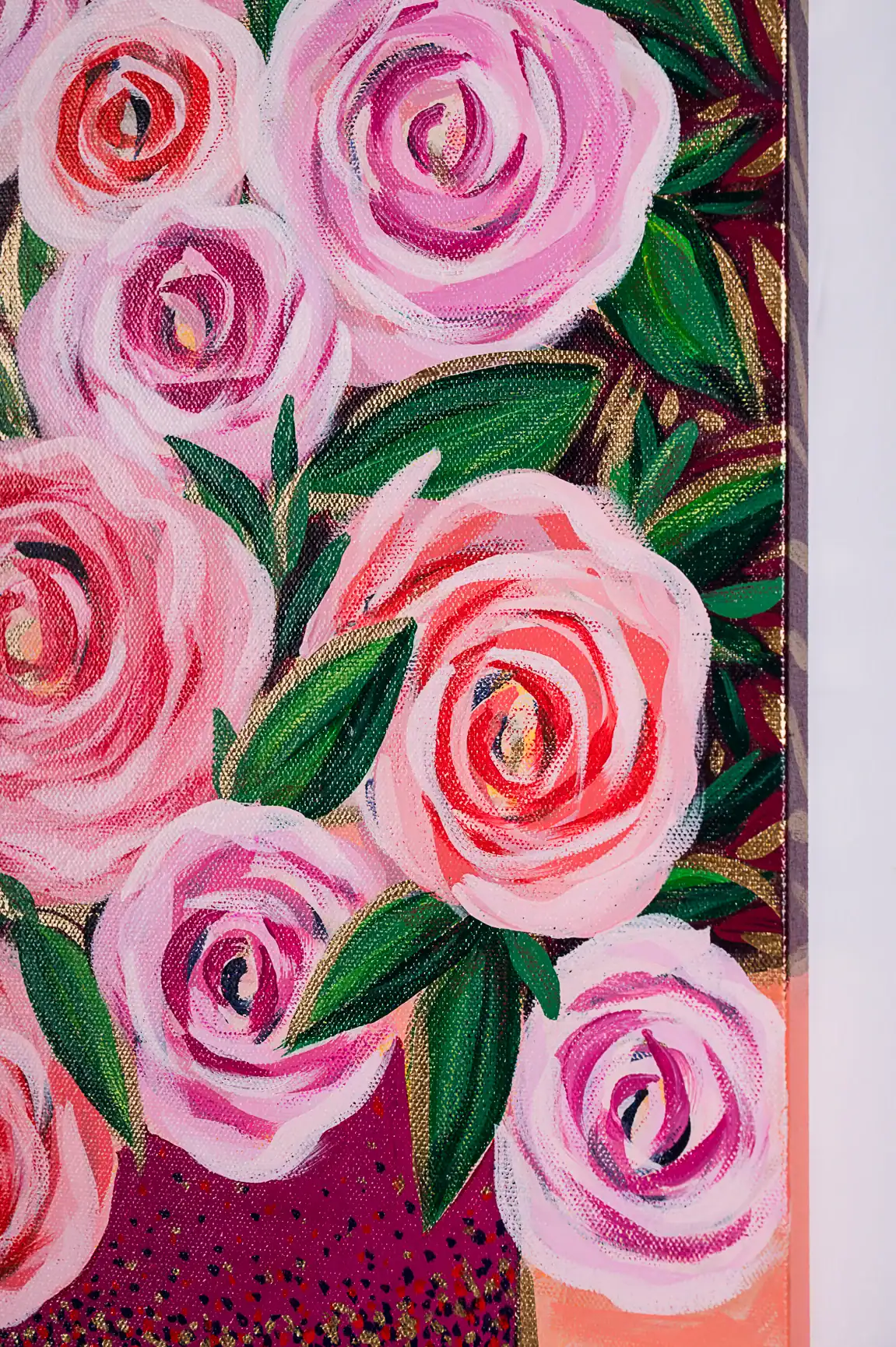 Overflowing with charm and unapologetic color, Two Dozen is a vibrant tribute to abundance, love, and all the reasons we bring flowers home. Swirls of blush, rose, and orchid pink burst from a deep berry vase, grounded by rich greenery and a glowing coral backdrop with lots of bronze/gold metallic accents. Every bloom feels like its own little moment and together, they create a full-hearted expression of joy and generosity.