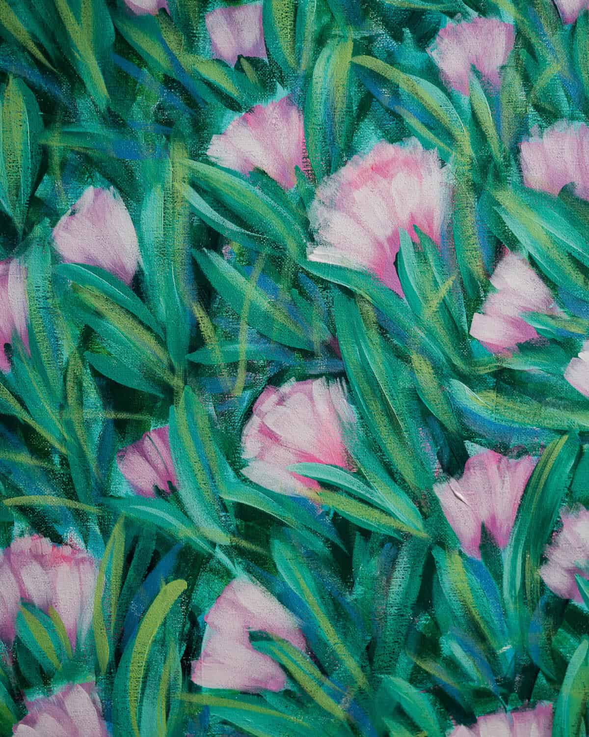 There’s a quiet rhythm in Caught in the Breeze, as if each flower is swaying to its own beat. Moody greens and deep brushwork anchor soft pink blooms, giving this piece a grounded sense of motion. It feels like the moment before a summer storm: vibrant, rich, and full of life just beneath the surface.