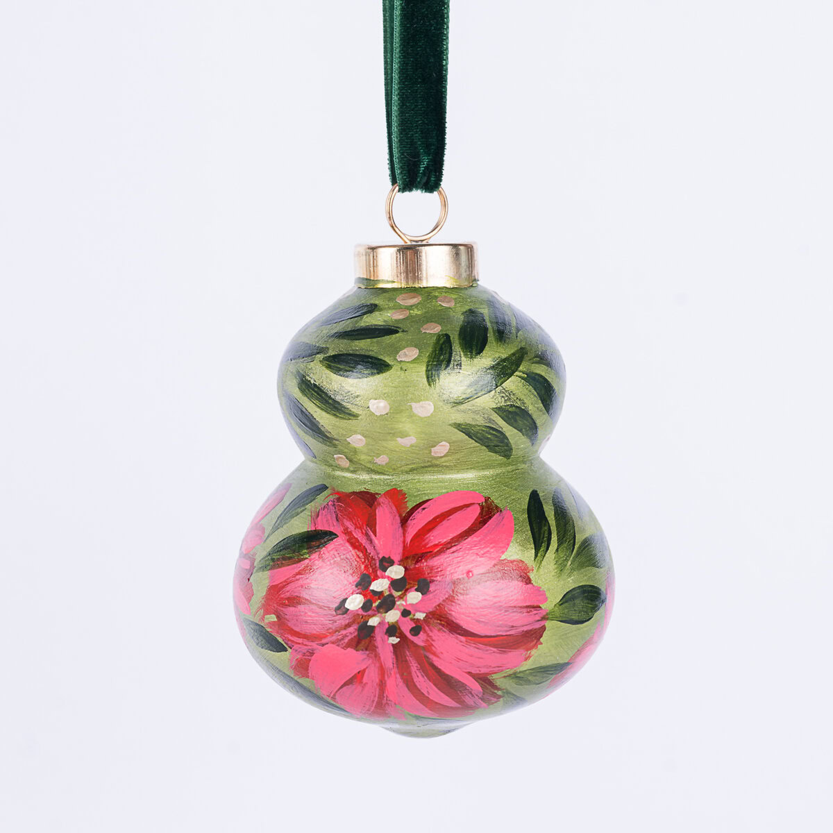 These hand-painted ceramic ornaments by Bonnie Sorsby feature elegant floral designs in warm greens, pinks, reds, cream, and gold. The unique fancy shape, with gently tapered bubbles and a pointed tip, adds a sophisticated twist to your holiday decor. Topped with a velvet green ribbon, they’re perfect for creating a stylish and unique look on your tree.