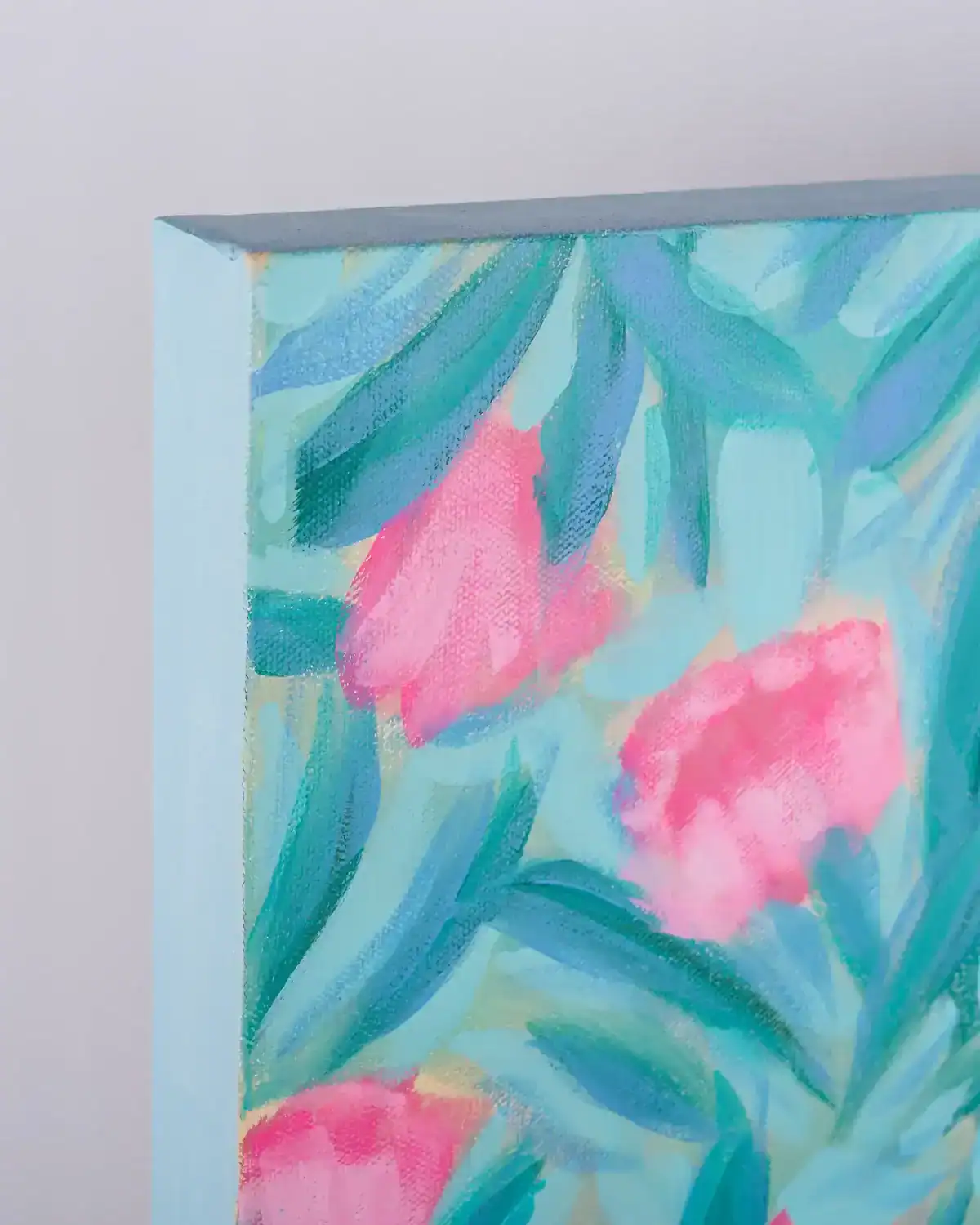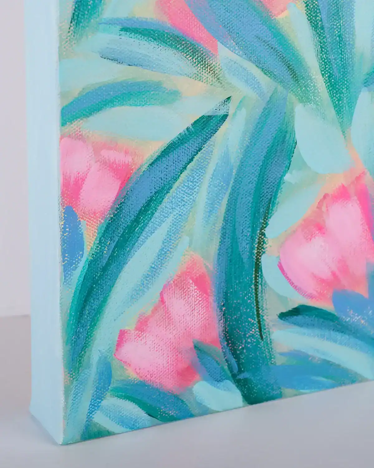In Full Swing is light, loose, and joyfully alive… a soft breeze of spring captured in motion. Petals pop in radiant pinks, floating among layered blue-greens that move like sunlight filtering through leaves. It’s a piece that hums with quiet energy, like the feeling of a fresh start blooming before your eyes.