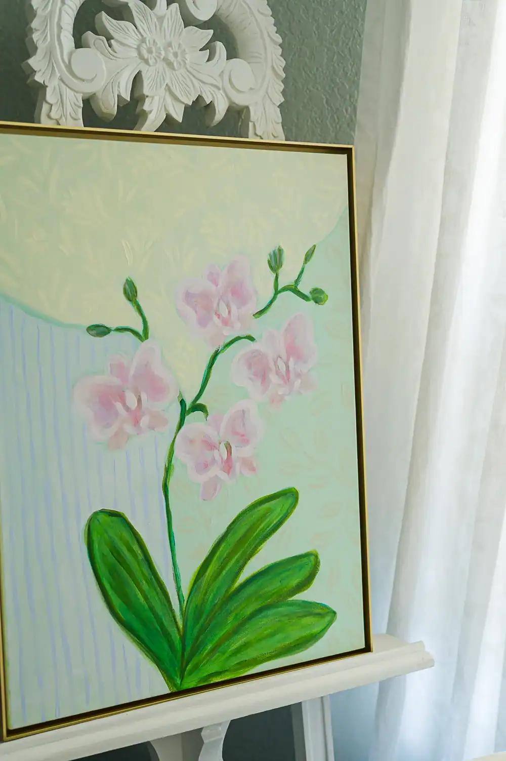 This piece is a gentle celebration of resilience. Into the Light features soft pink orchids stretching upward against a patchwork of delicate patterns and pastel tones. There’s something quietly powerful about their presence… graceful yet grounded. It’s a reminder that growth doesn’t have to be loud to be meaningful.