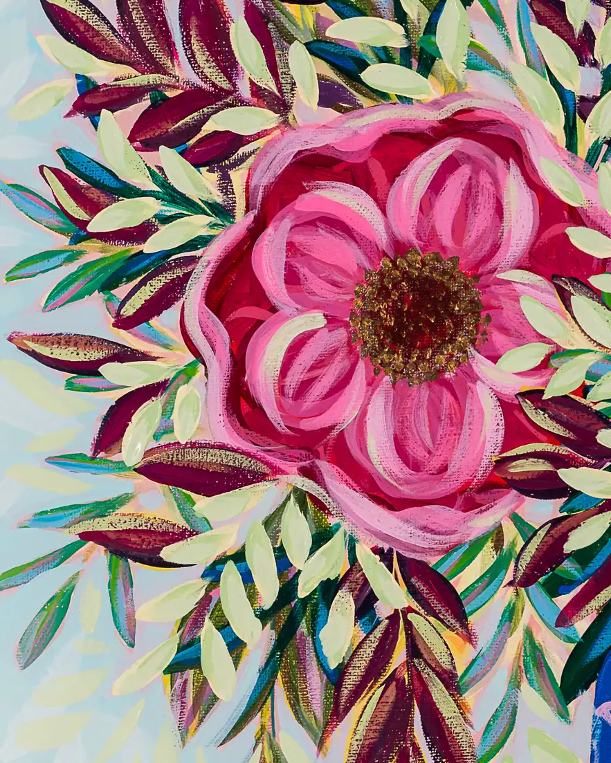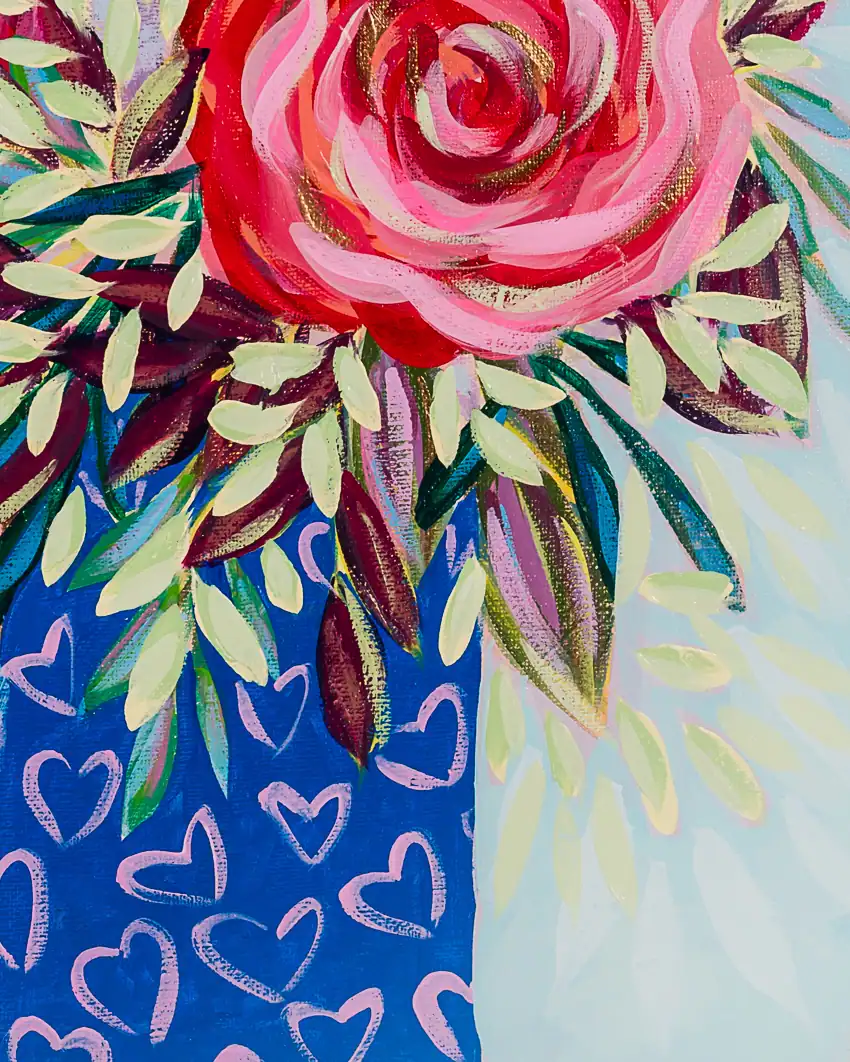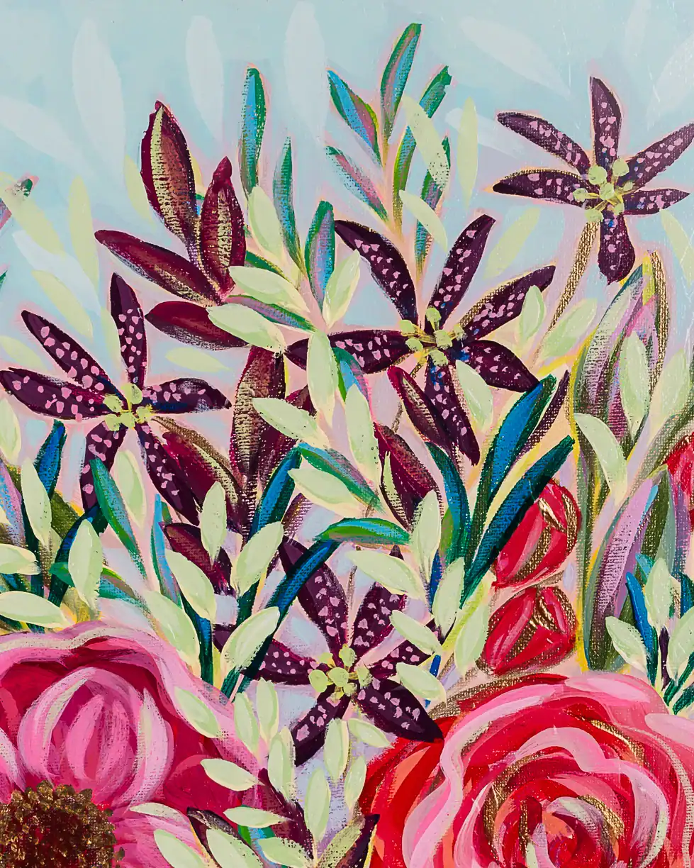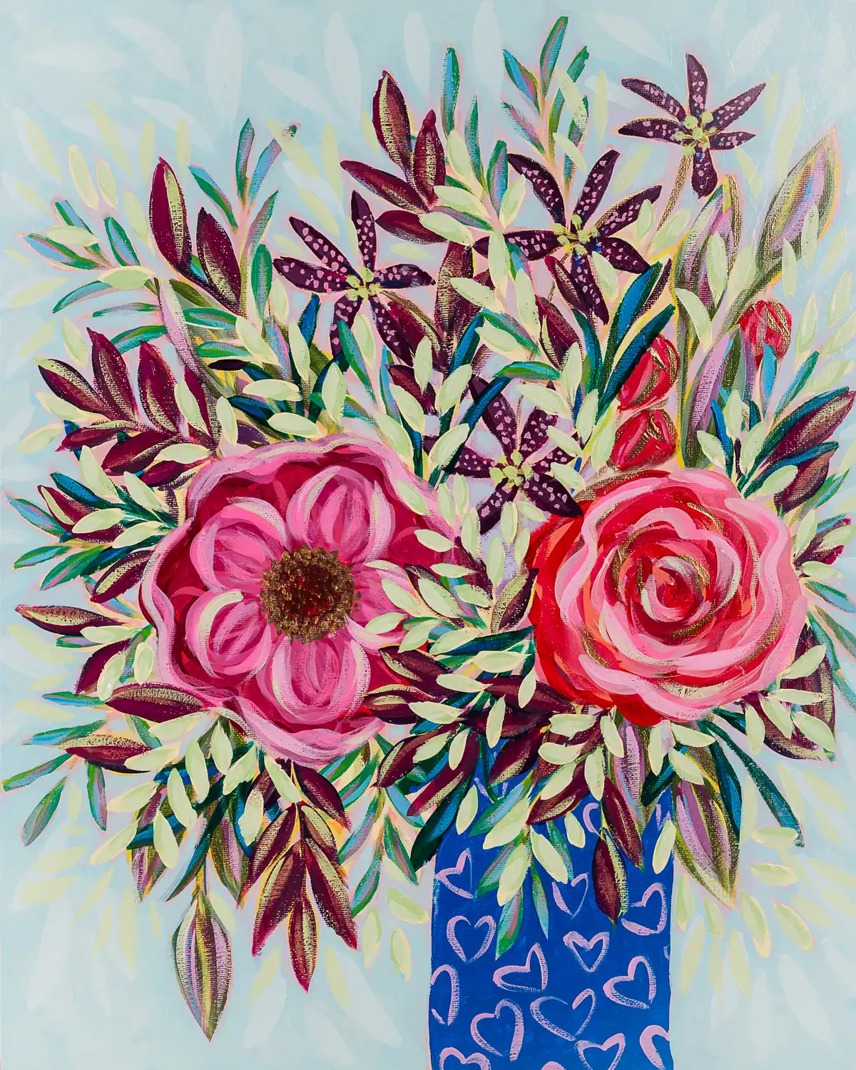 Bright, full of momentum, and unapologetically bold — You and Your Big Ideas is a visual celebration of creativity in bloom. With sweeping magenta petals, deep leafy textures, and a heart-covered cobalt vase, this piece radiates confidence and warmth. It’s a tribute to the dreamers, the doers, and the moments when inspiration strikes out of nowhere and fills the whole room.