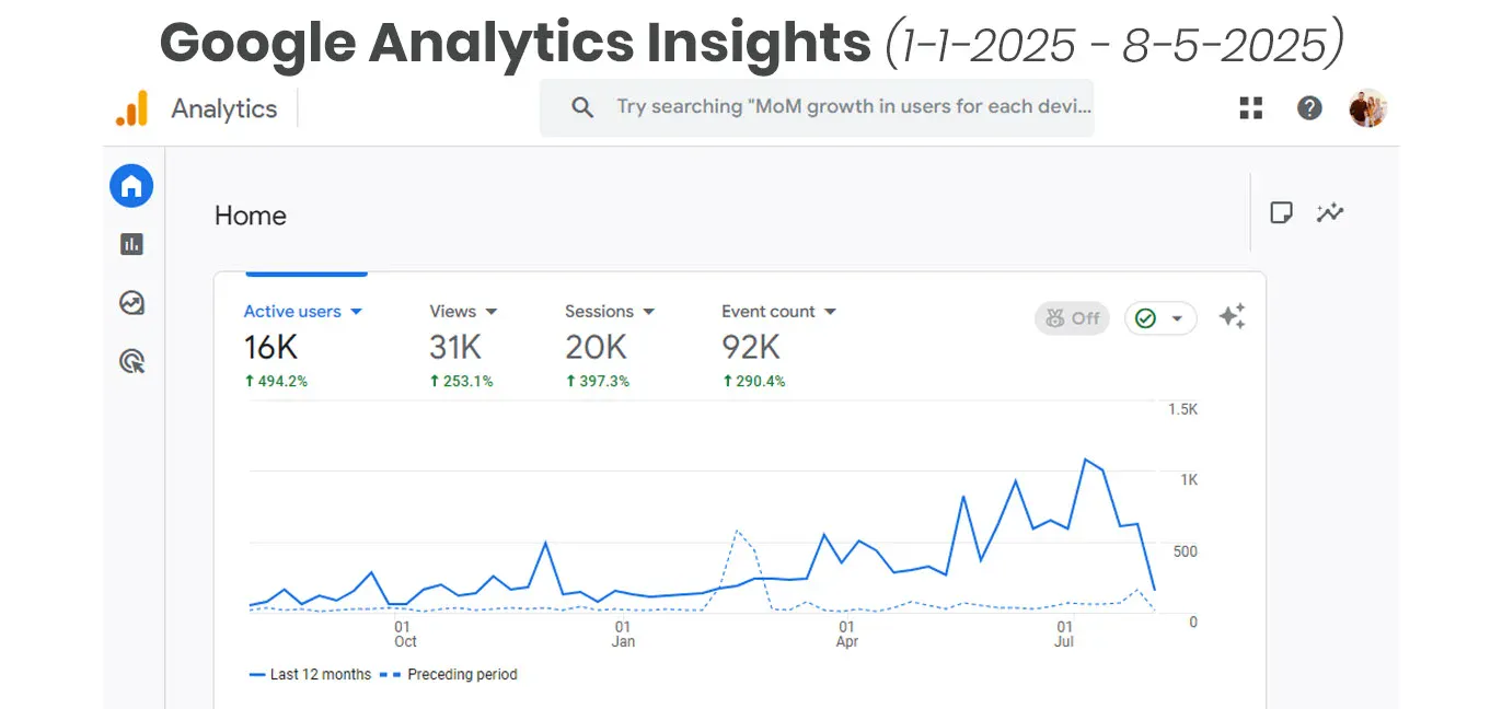 Google Analytics line graph showing slow and steady website traffic growth over the past year, highlighting consistent progress in wellness marketing.