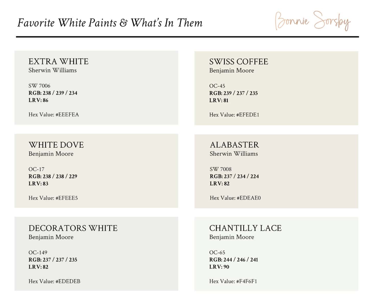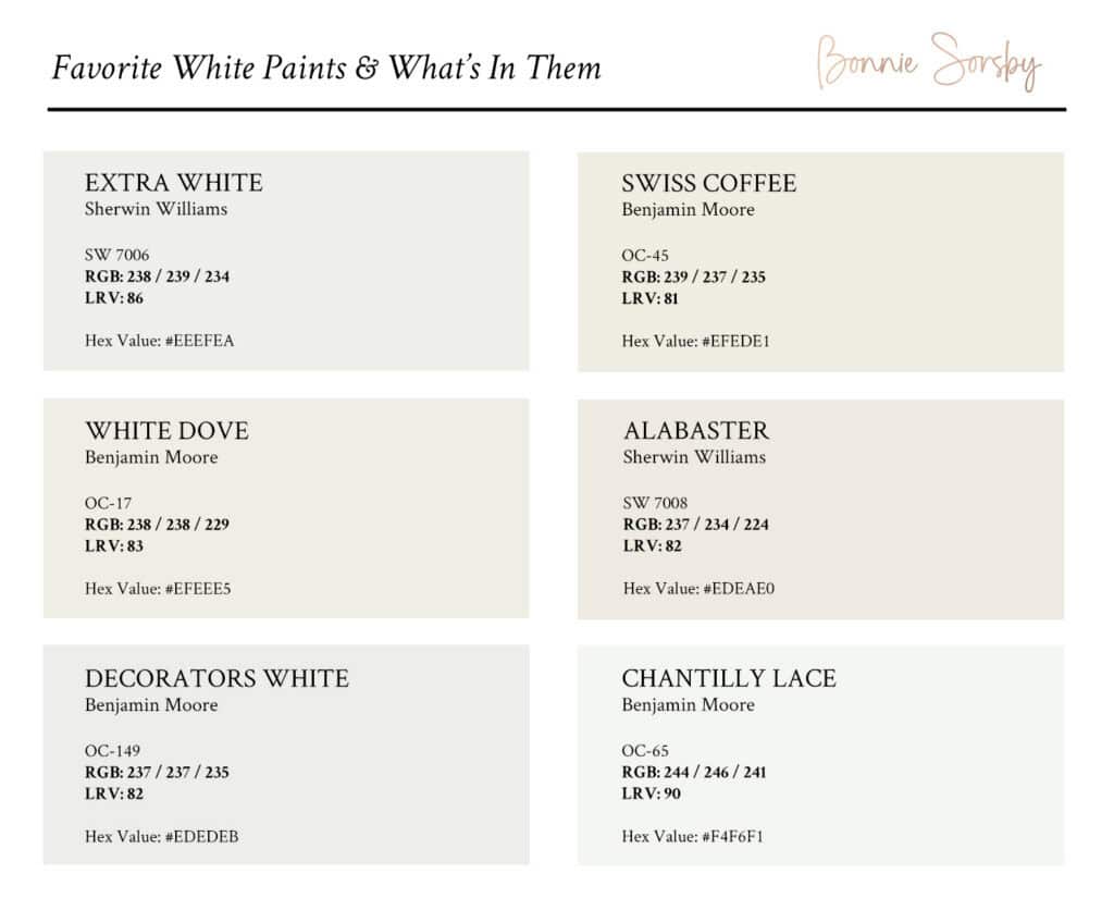 This easy to reference guide provides a thorough understanding of what RGB values can tell you about the true undertones in white paints, allowing you to confidently get started with paint samples!