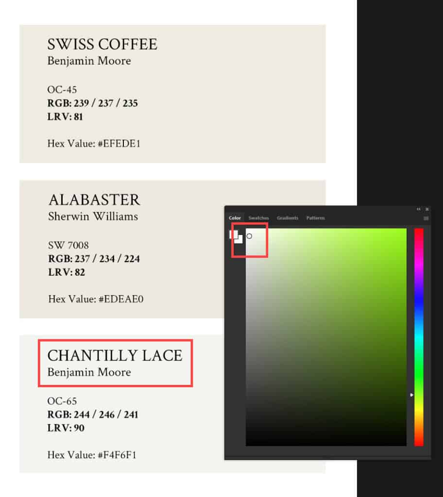 I don’t know about you, but a visual really goes a long way for me, so I put together a graphic to show you what I mean. We’ll take a look at some designers favorites for “white” paint colors and what their RGB values are able to show us: